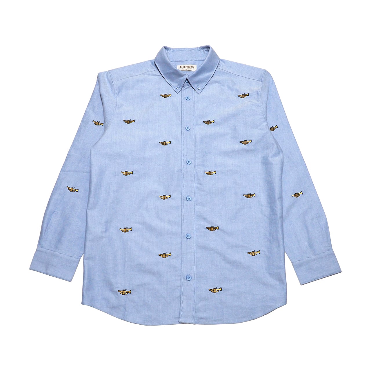 流行に左右されないベーシックなシルエットに、バンドの花形であるトランペットを刺繍したボタンダウンシャツ。春先には一枚で、秋冬にはTシャツやジャケットに合わせて重ね着も楽しめます。